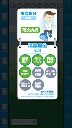 整個H5采用的是扁平卡通風格,容合了企業(yè)的核心勝任力內容,讓用戶在游戲過程中深刻認識本公司的核心勝任力。